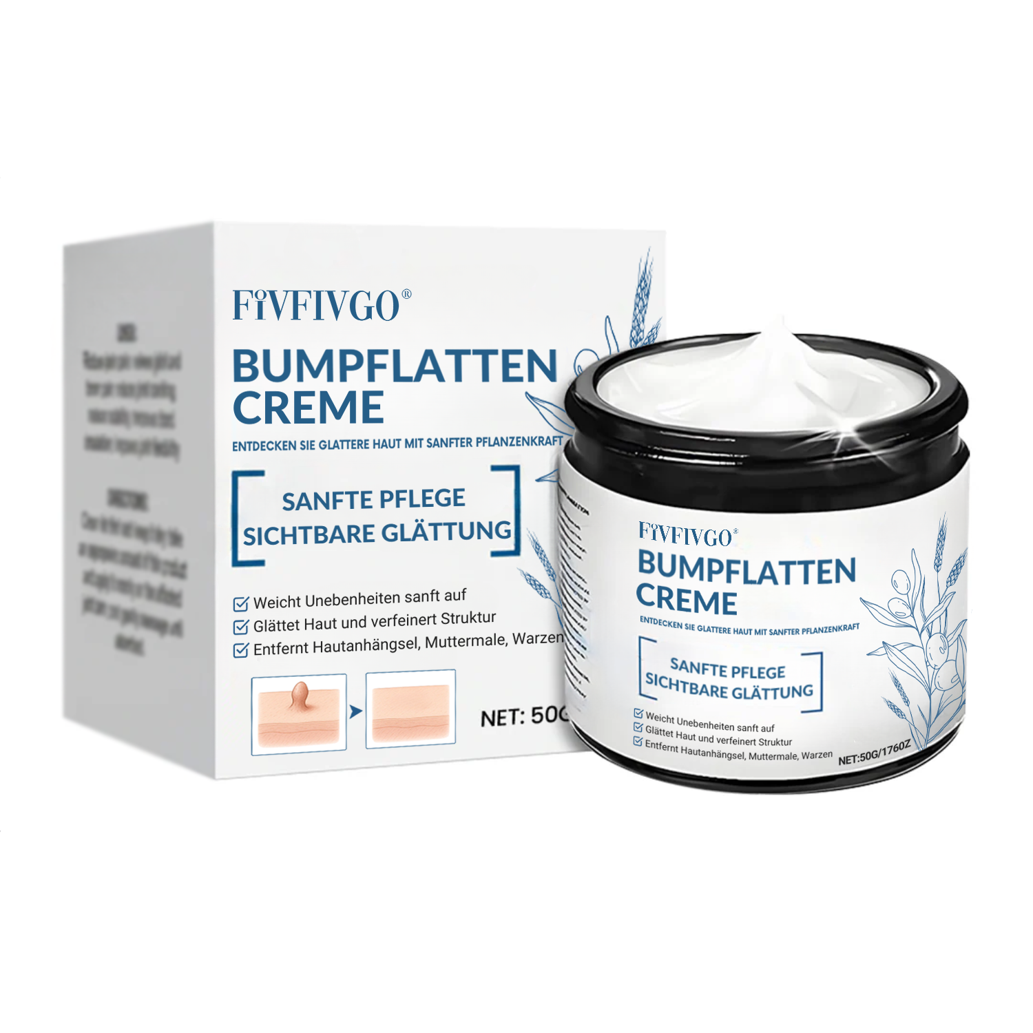 Fivfivgo® BumpFlatten Creme wirkt auf zellulärer Ebene und macht Erhebungen, Hautanhängsel, Warzen und Muttermale sanft weich. Die pflanzliche Formel hilft, verhärtetes Keratin aufzulösen und unterstützt die natürliche Hauterneuerung, sodass raue oder erhabene Stellen allmählich geglättet werden und glatter erscheinen.