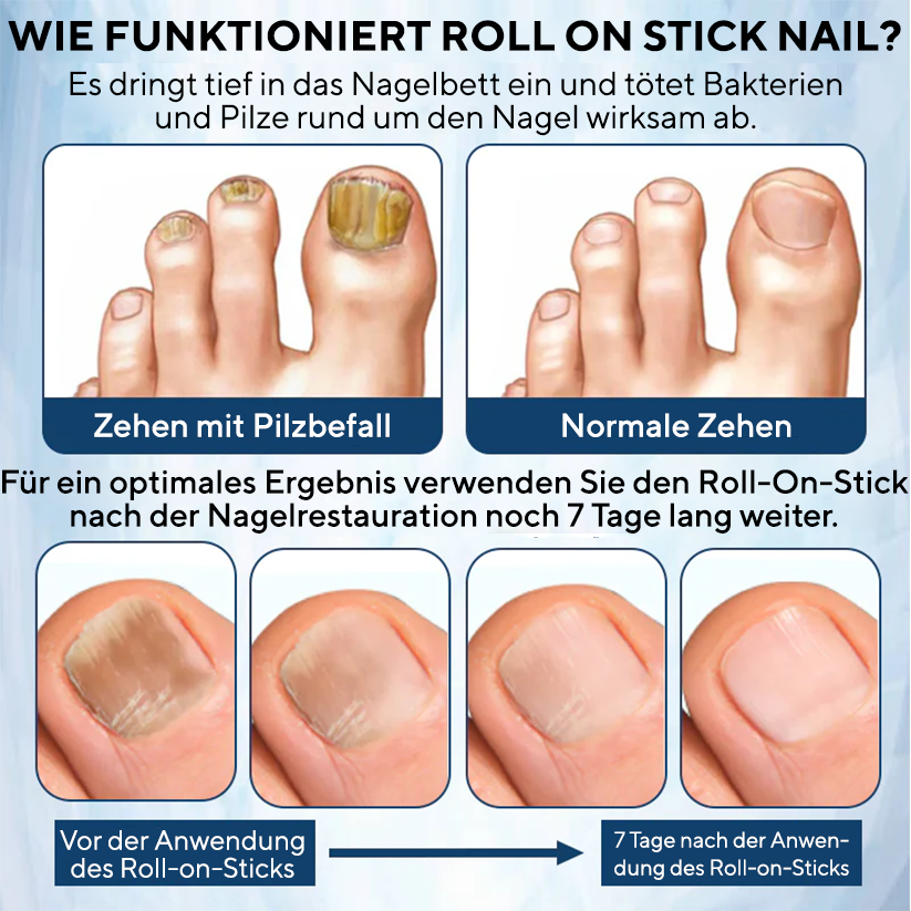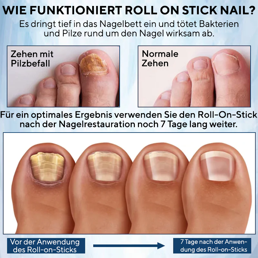 „Die Pilzinfektion in meinem Zehennagel machte meinen Alltag schmerzhaft und unangenehm. Die Verwendung dieses Roll-on-Sticks wurde schnell zu einem Teil meiner Routine und verschaffte mir spürbare Linderung. Mein Nagel sieht jetzt klarer, gesünder und glatter aus und ich muss mir keine Sorgen mehr machen, dass mich die Infektion den ganzen Tag über ablenkt.“ - Claire Peterson