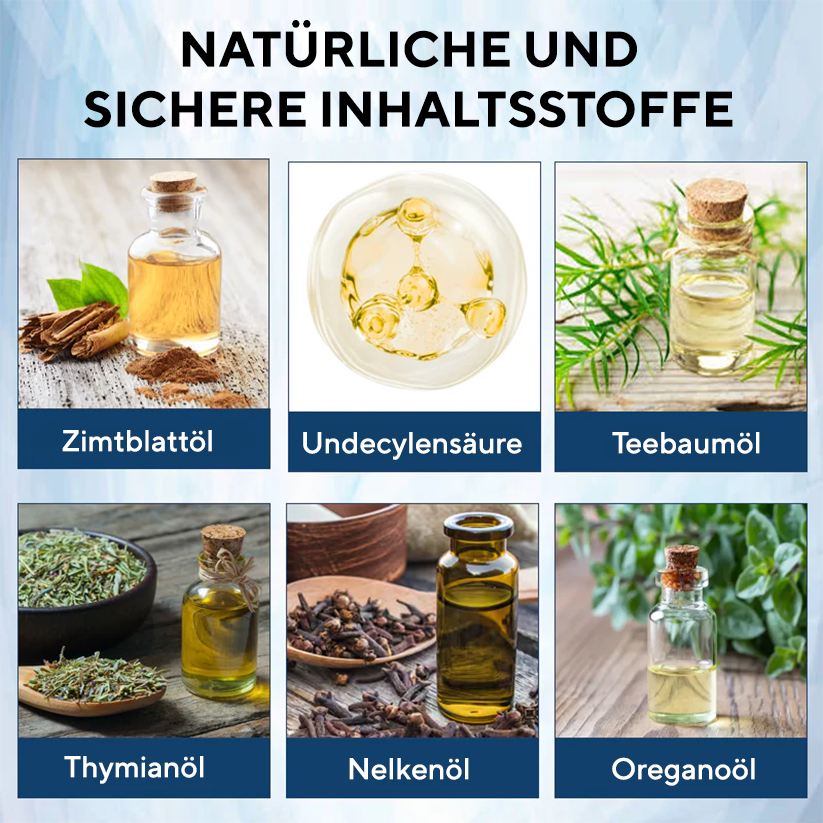 - Zimtblattöl – Reich an Zimtaldehyd, bietet es eine breit gefächerte antimikrobielle Wirkung und verbessert das Eindringen in das Nagelbett.