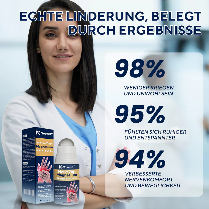 Haben Sie genug von Brennen, Kribbeln oder Unruhegefühlen, die einfach nicht verschwinden? Erleben Sie schnelle, gezielte Linderung mit NovaRX® NerveZap Magnesium-Therapie Roll-On – einer bahnbrechenden Nerventherapielösung, die überaktive Nerven beruhigt, neuropathische Beschwerden lindert und Ihnen das tägliche Wohlbefinden zurückgibt, ganz ohne lästige Cremes oder Pillen.