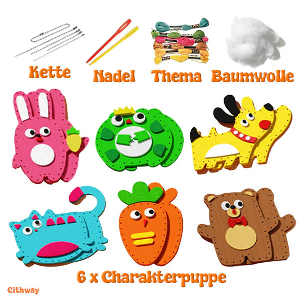 Das lustige Bastelset bietet 6 niedliche, vorgeschnittene und gelochte Vorlagen, die zu niedlichen Puppenspielzeugen genäht werden können, die Ihre Kinder garantiert begeistern werden. Das Set enthält einen Frosch, einen gelben Hund, einen rosa Hasen, eine blaue Katze, einen braunen Bären und ein Karotten-Gemüse. So können Ihre Kinder ihre Kenntnisse und Fähigkeiten in der Kunst des Bastelns erweitern, während sie ihr eigenes hübsches Lieblingsspielzeug nähen. Und was ist das Beste? Die fertigen Tiere und Gemüsepuppen können in lustige Schlüsselanhänger verwandelt werden, die sie immer und überall mitnehmen können.